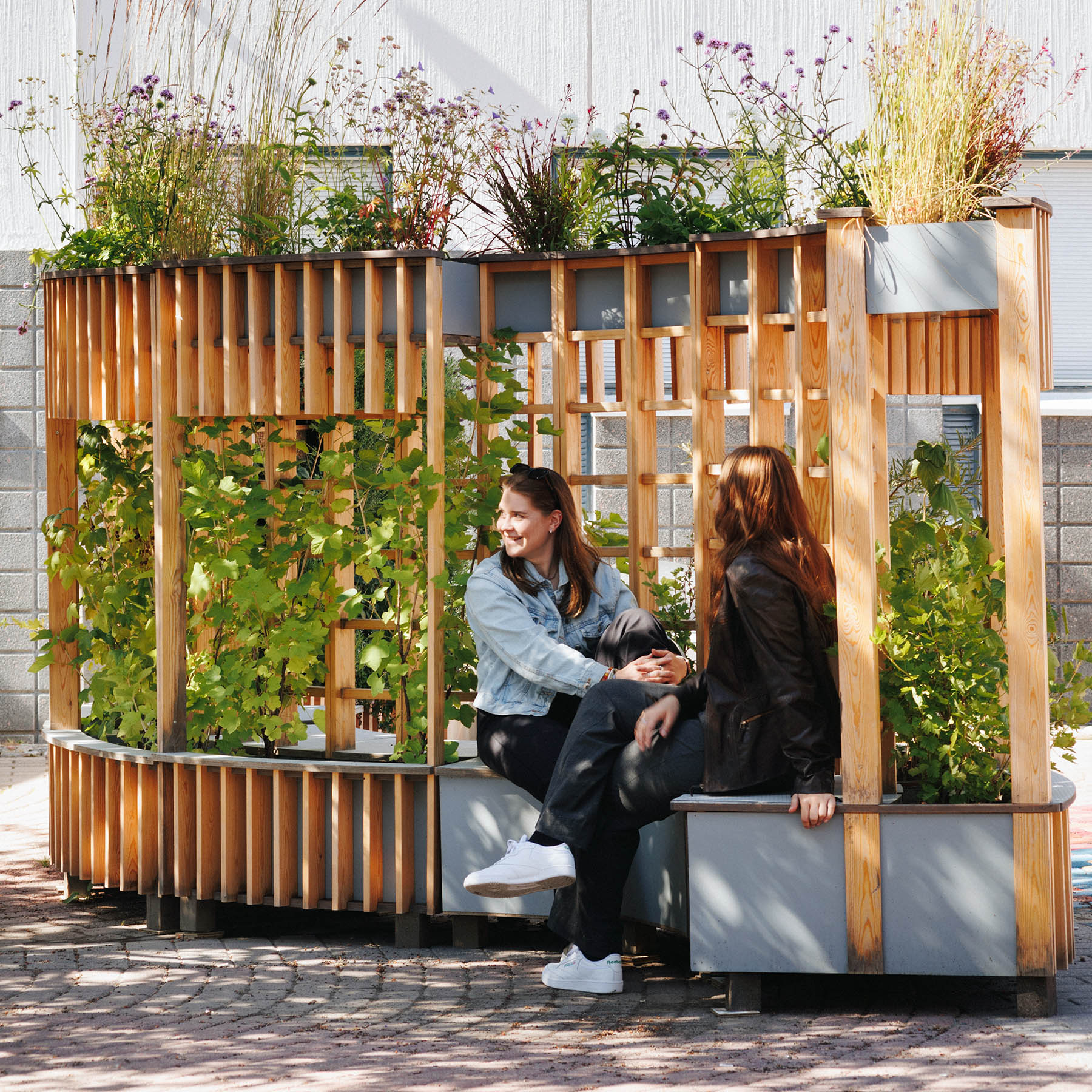 Modulaarisuuden ansiosta voit yhdistellä viherkalusteista, kuten penkeistä ja viherseinistä,